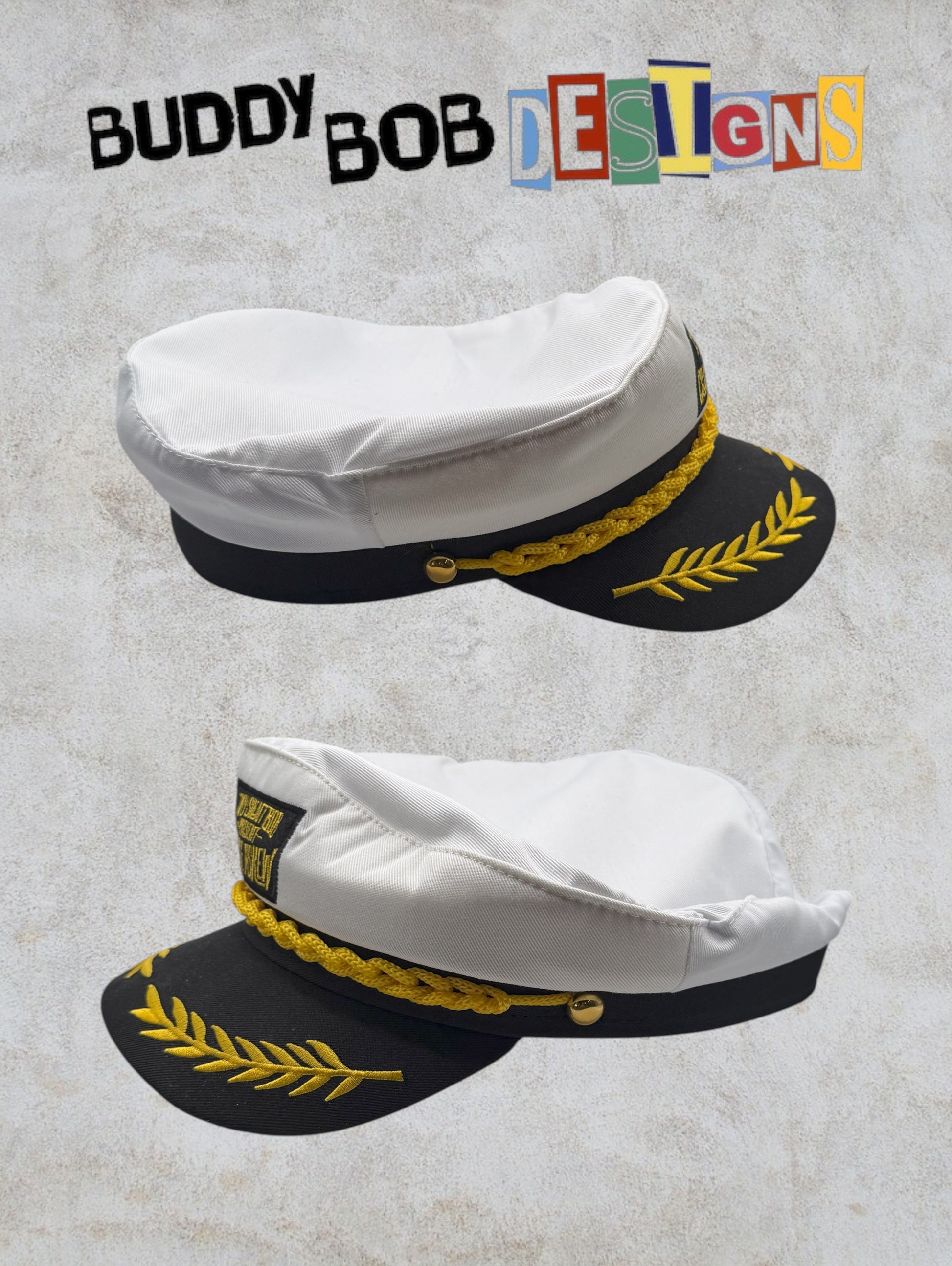 Classic Captain's Hat Design: White crown, black brim with gold embroidered laurel leaves, and a gold braided cord.