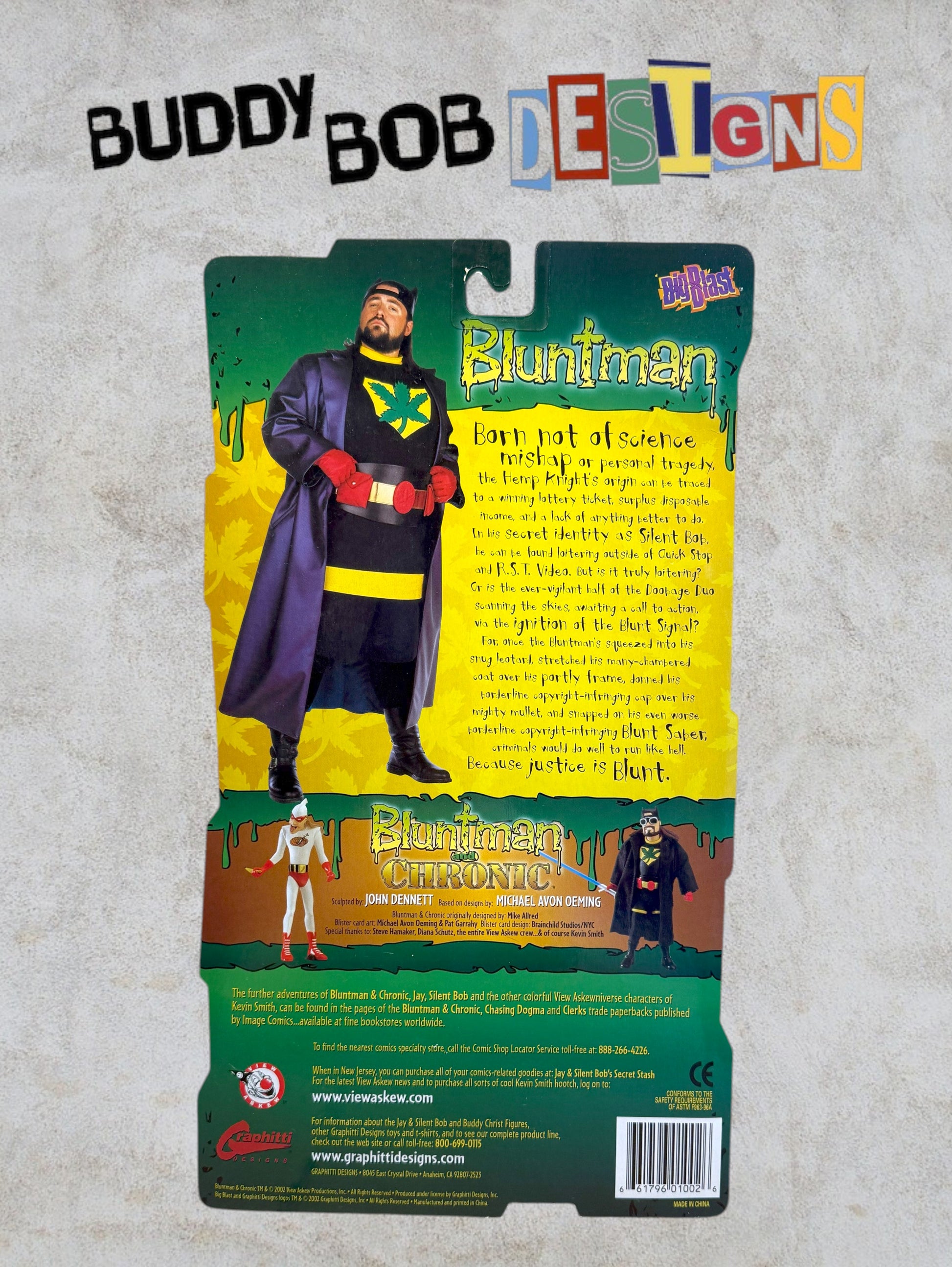 Unleash your inner crime-fighting stoner with this vintage Bluntman action figure by Big Blast Toys! This collectible is a true gem for any fan of the View Askewniverse, capturing the iconic superhero alter-ego of Silent Bob from the beloved Bluntman and Chronic.
