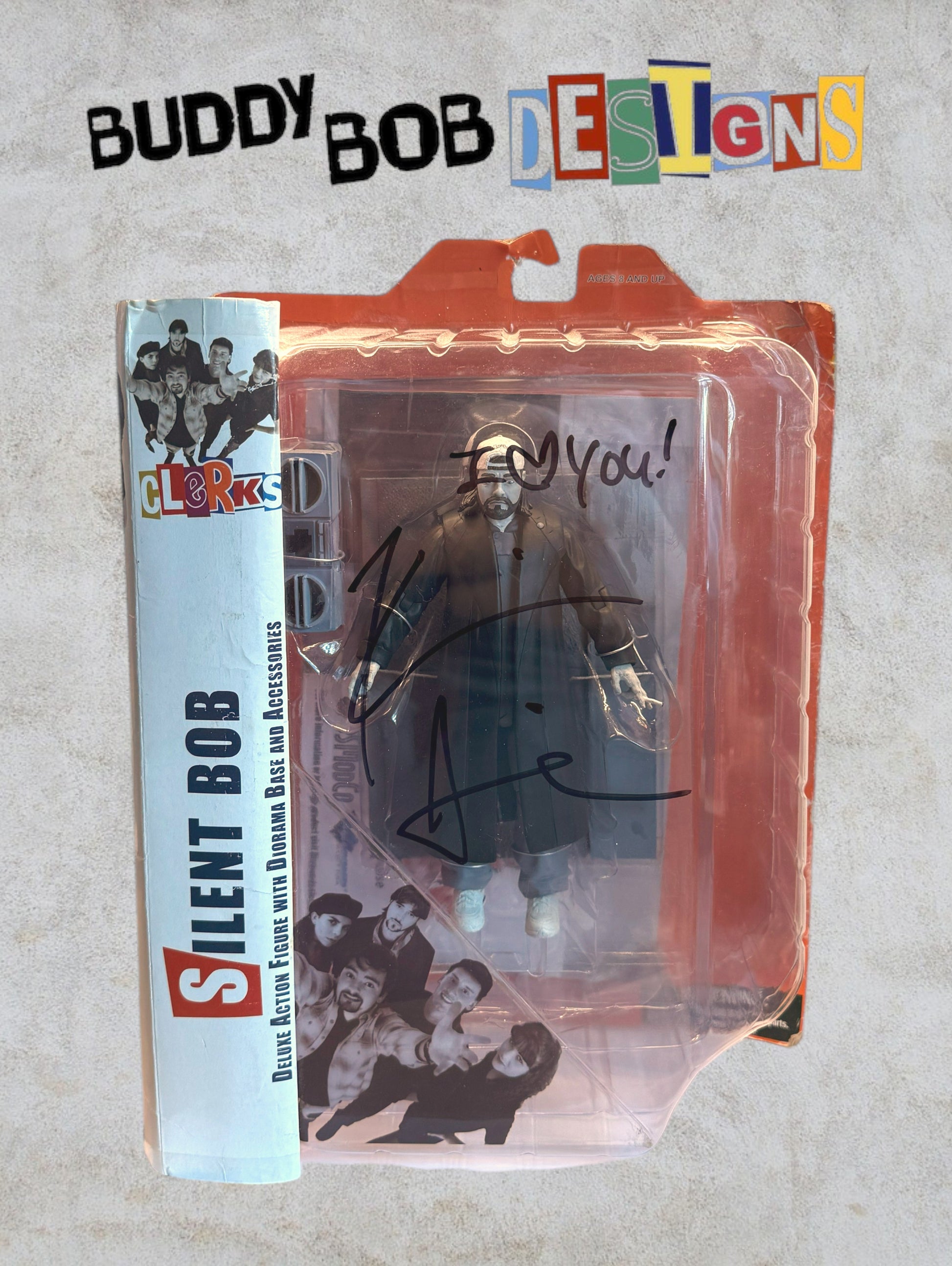 What elevates this figure to a truly special status is the authentic autograph of Kevin Smith himself, the visionary director, writer, and the silent, yet profoundly impactful, portrayer of Silent Bob. Adding a deeply personal touch, Smith has also inscribed a heartfelt "I ❤️ you!" directly on the blister, making this a unique and incredibly valuable piece of cinematic history.
