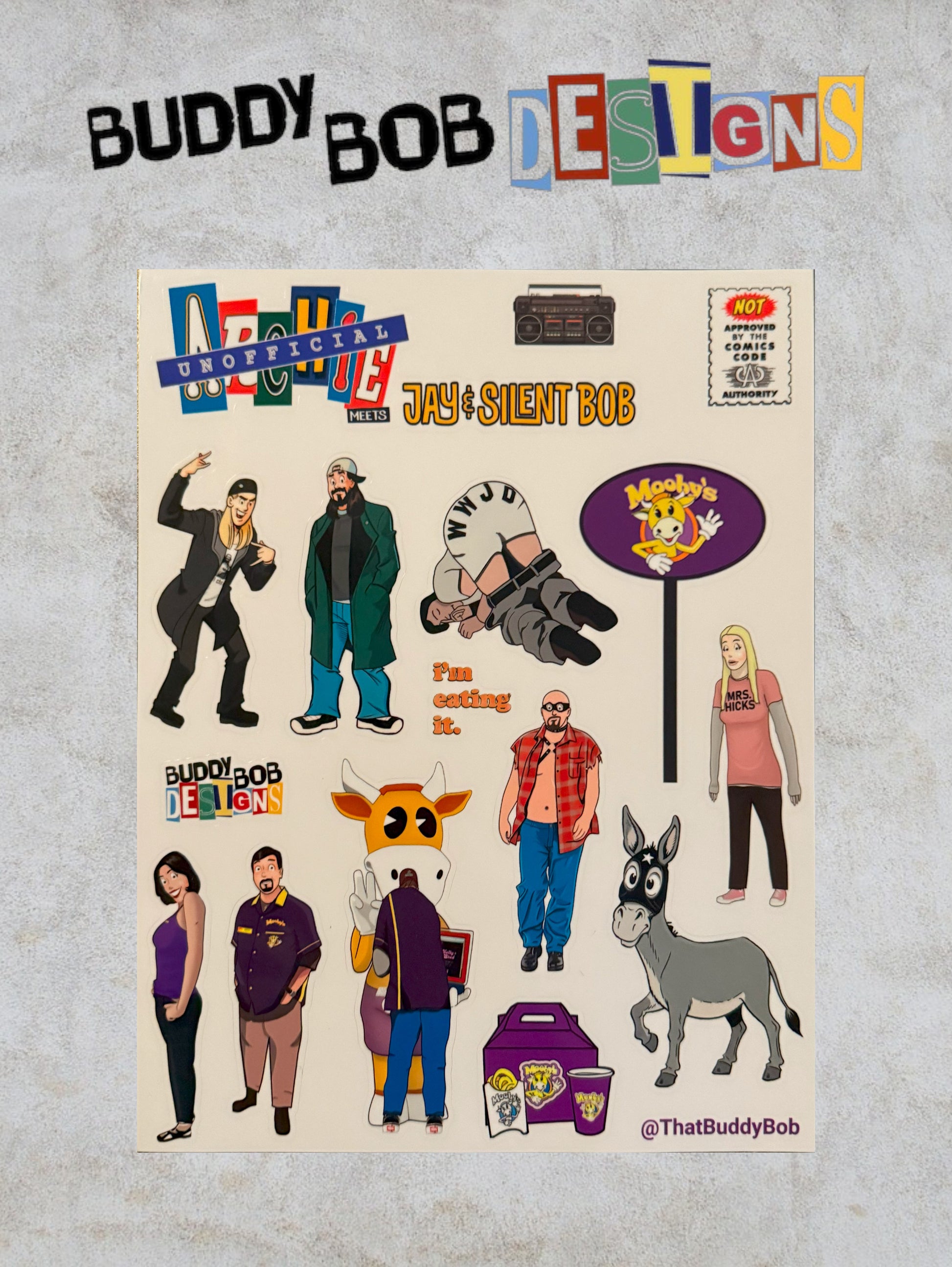 Unofficial Archie Meets Clerks 2 Sticker Sheet: This custom sticker sheet is packed with all your favorite characters from Clerks II, re imagined in the classic Archie Comics art style. You'll find Dante, Randal, Becky, Elias, Emma, Kinky Kelly, The Sexy Stud, Jay and Silent Bob (if you want to double down on the crossover fun!), and a few fun extras, all ready to stick onto your comic masterpiece (or whatever else you want to Clerks 2-ify).