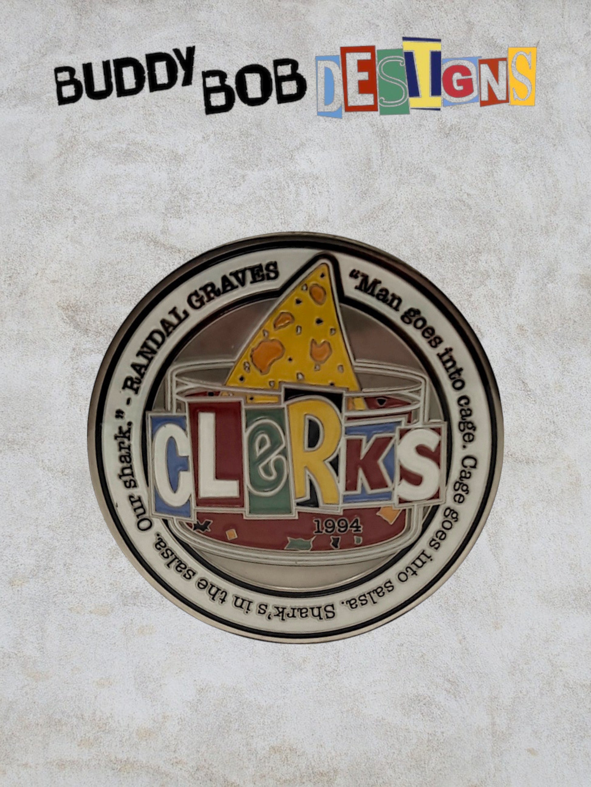 This premium, heavyweight challenge coin features a vibrant, detailed depiction of the legendary Clerks logo over the Salsa Shark – that singular tortilla chip, forever immortalized, daringly submerged in a sea of rich red salsa. The iconic Salse Shark quote is boldly emblazoned, circling this unforgettable image, ensuring every glance brings a smile and a flood of classic Randal lines to mind.