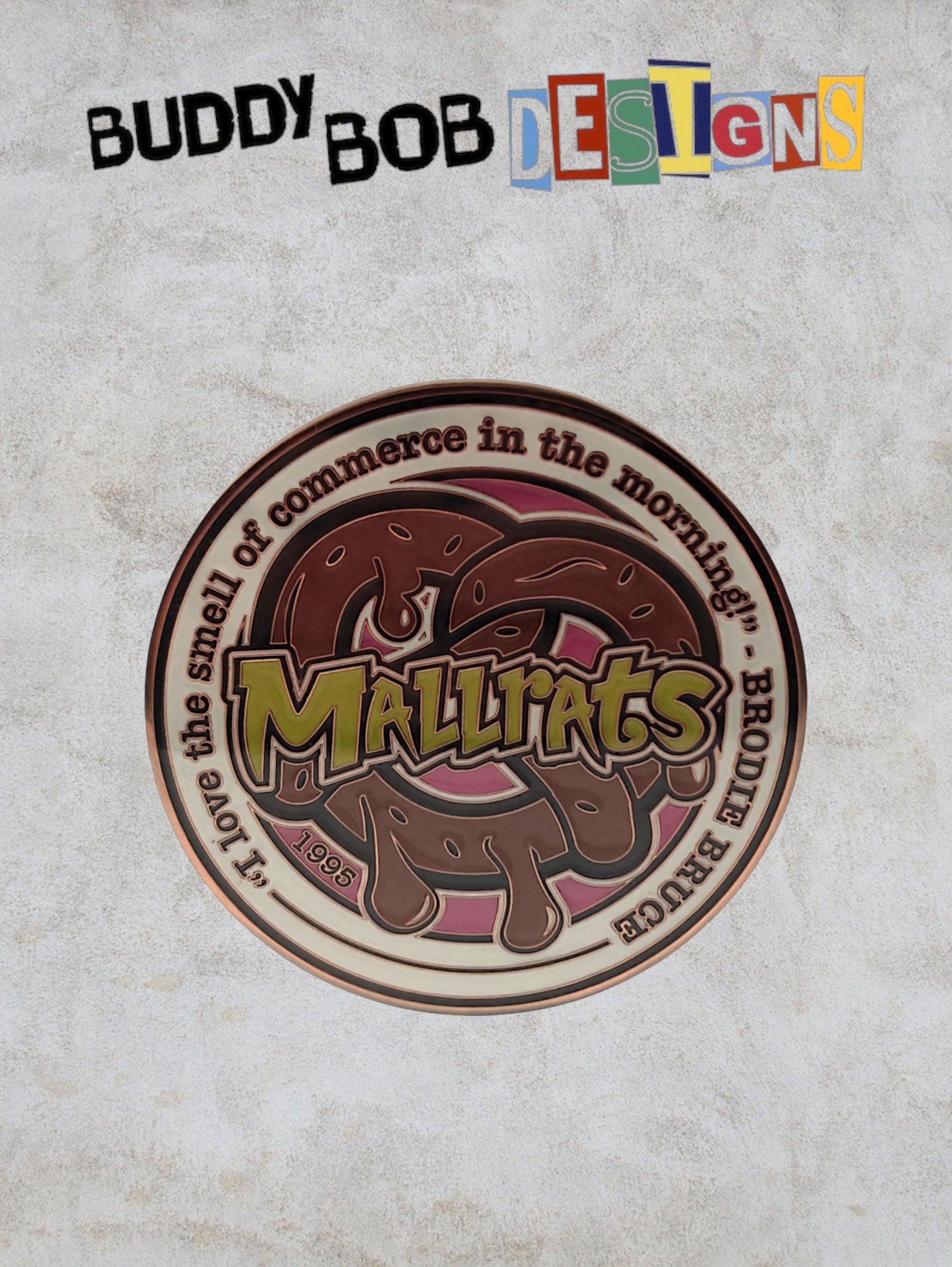 This isn't just any challenge coin; it's a hefty, premium piece crafted with the true fan in mind. Featured prominently is a disturbingly drippy chocolate-covered pretzel, a not-so-subtle nod to the mallrats's sweet revenge. Emblazoned atop the pretzel, you'll find the classic Mallrats title, instantly transporting you back to the Eden Prairie Center. Encircling it all, in bold, clear lettering, is Brodie's mantra: "I love the smell of commerce in the morning."