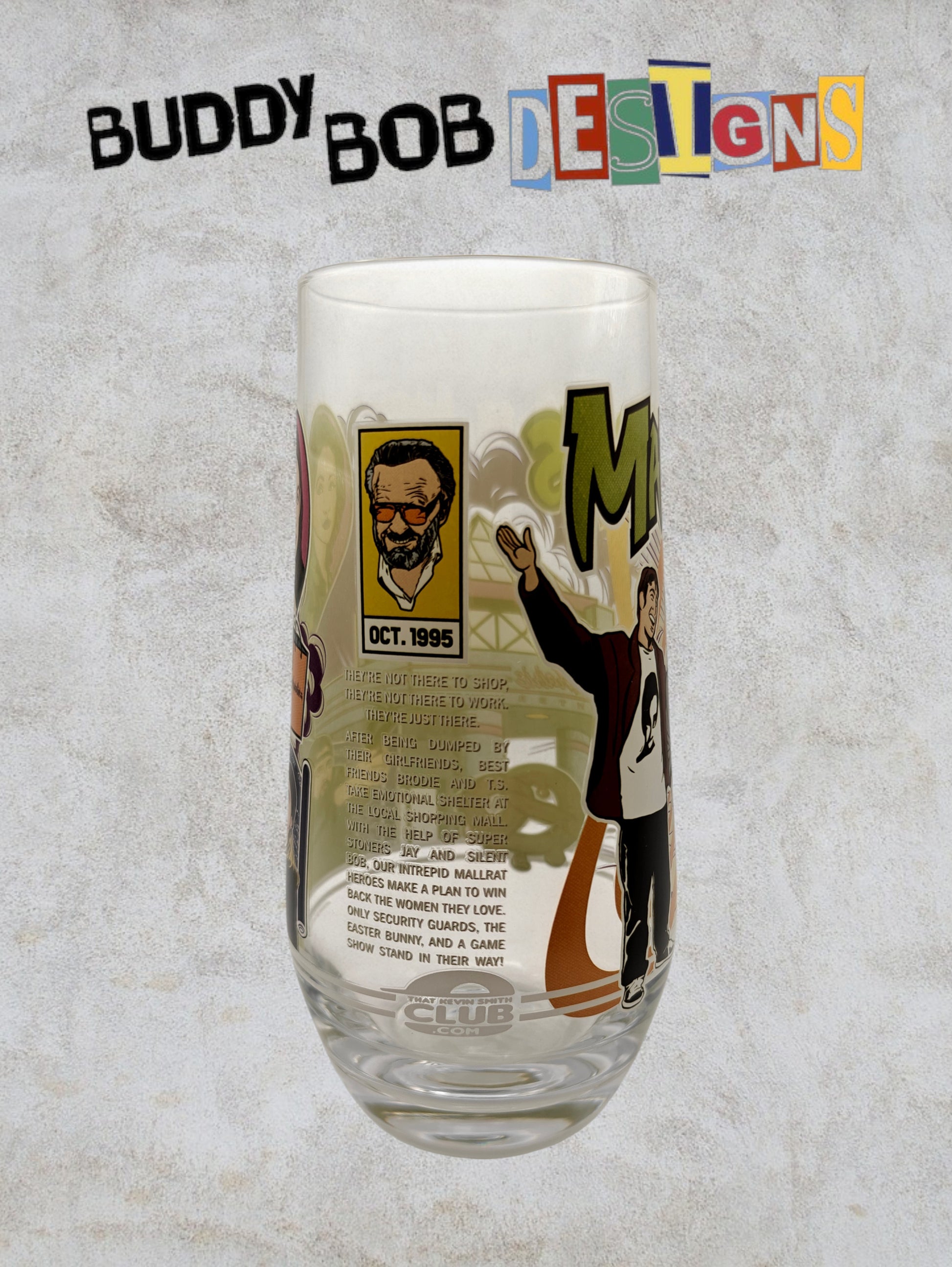 This Kevin Smith Club Exclusive Mallrats Glass is a pristine collectible, brand new and still in its original box. Perfect for fans and collectors, it offers a unique piece of memorabilia from the iconic Mallrats film, combining both display appeal and exclusivity. Its gorgeous artwork and limited availability make it a valuable addition to any Kevin Smith collection.